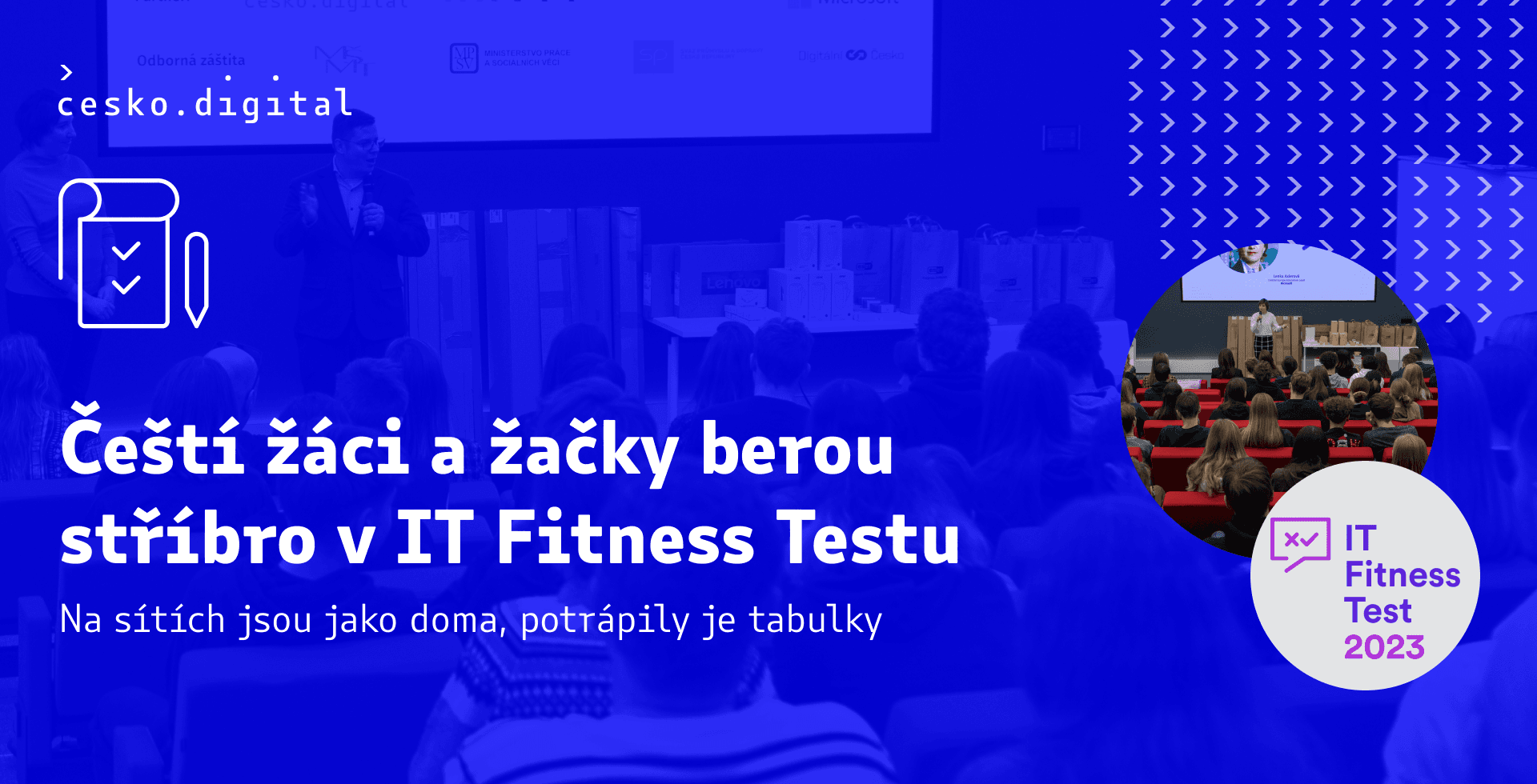 Česko.Digital je společně s organizací AAVIT partnerem měření digitální gramotnosti IT Fitness Test 2023 v České republice. Jde o mezinárodní test, který prověří digitální dovednosti, nikoliv znalosti studentů, napříč zeměmi V4. Letos v České republice pořádáme druhý ročník a máme za cíl více než zdvojnásobit počet respondentů z více než 8,000 v roce 2022 na celkem 20,000 studentů, kteří se do testu zapojí.